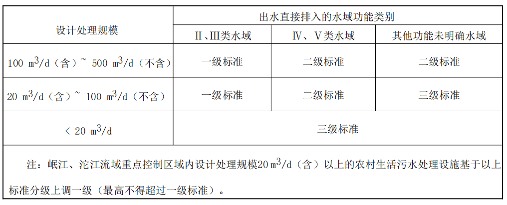 b) 根据污水处理设施出水直接排入的水域功能类别和设计处理规模,将农村生活污水处理设施水污染物排放标准划分为一级标准、二级标准和三级标准,各级标准的适用情况见表 1。其中, 岷江、沱江流域重点控制区域内(参见附录A),设计处理规模 20 m3/d(含)以上的农村生活污水处理设施对应表 1 所列标准上调一级(最高不得超过一级标准);